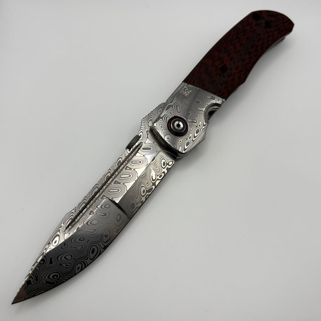 This is a Bob Terzuola design brought to life by Custom Knife Factory! This knife features a MRBS with a Damasteel compound ground blade. It has red carbon fiber scales and Damasteel bolsters with a Zirc backspacer and MokuTi pivot collars. This can be opened with the thumb stud, flipper tab, or with the front flipper.