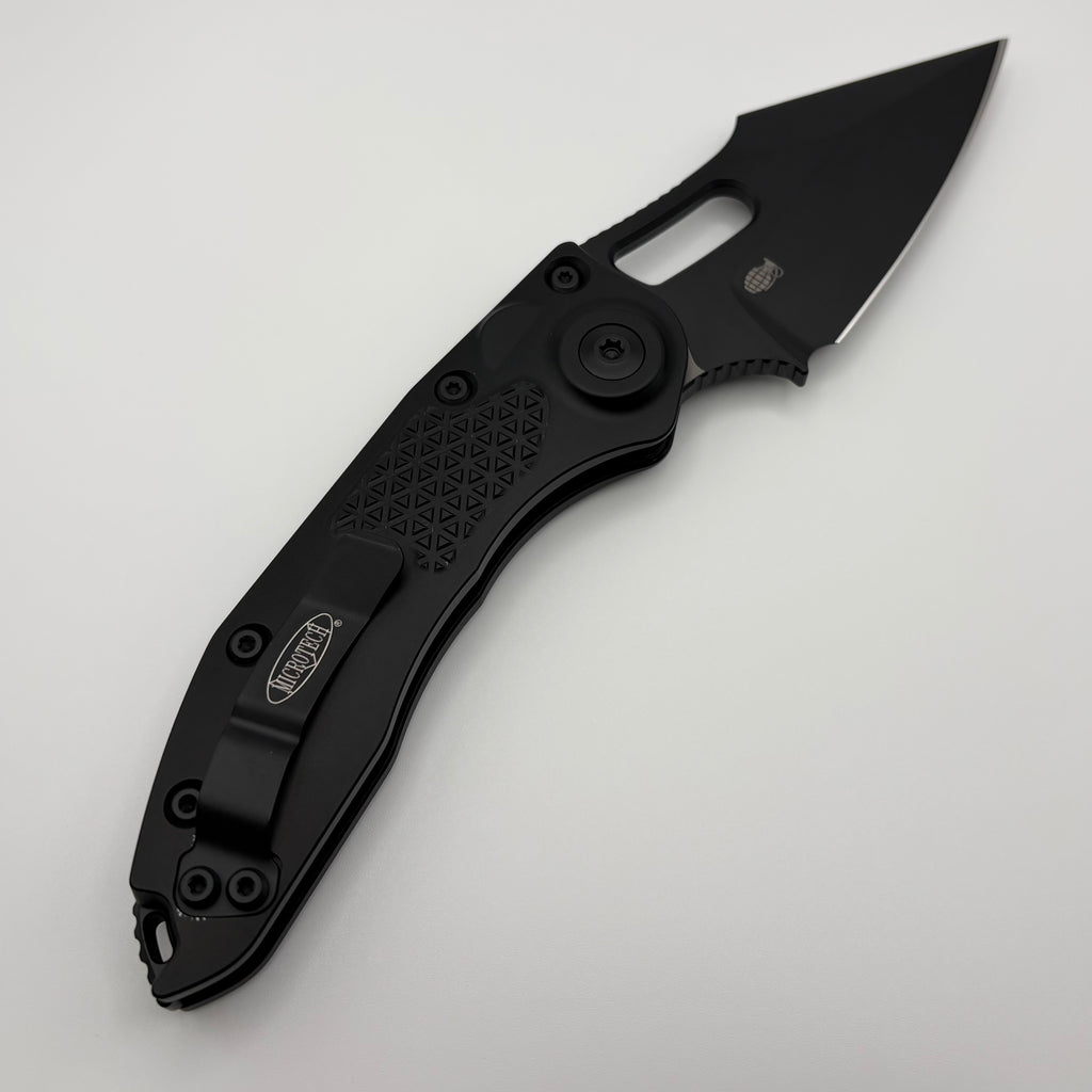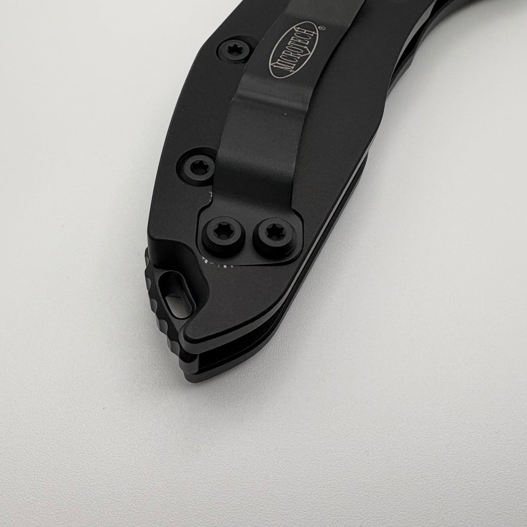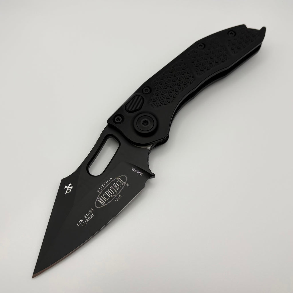The Microtech Stitch is a production version of the custom knife collaboration between Marfione and Borka Blades. This model features a spear point style blade, substantial choil and thumb ramp, and a knurled alloy handle with a black finish. Most of our Stitch knives come fitted with bead blasted hardware unless DLC or Tactical, and a secure right-hand, tip-up carry pocket clip.