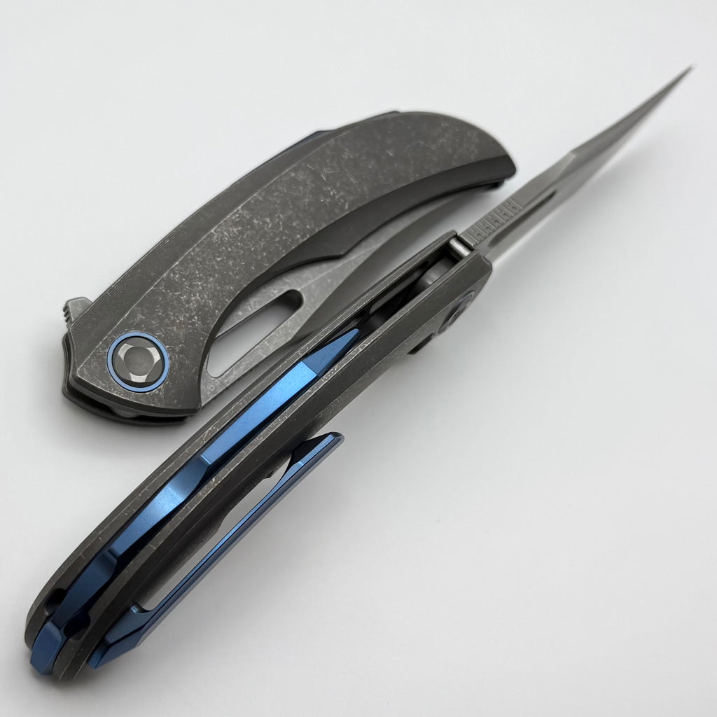 Poikilo Blade Armadillo S2 Dark Stonewash Titanium Handles w/ Blue Ti Accents & Dark Stonewash M398