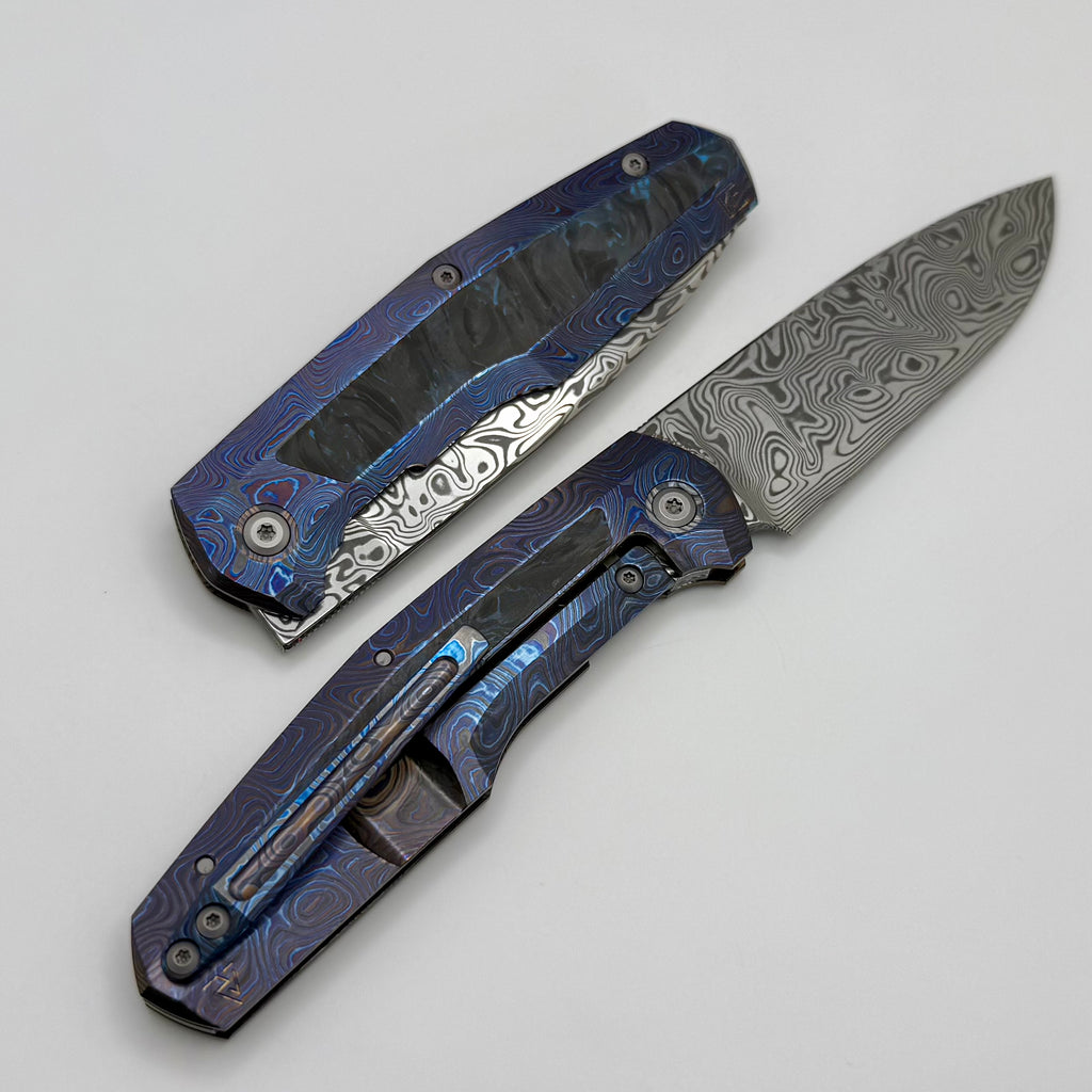 This limited version has a damasteel blade and ZircuTi handles with a blue/black carbon fiber inlays!