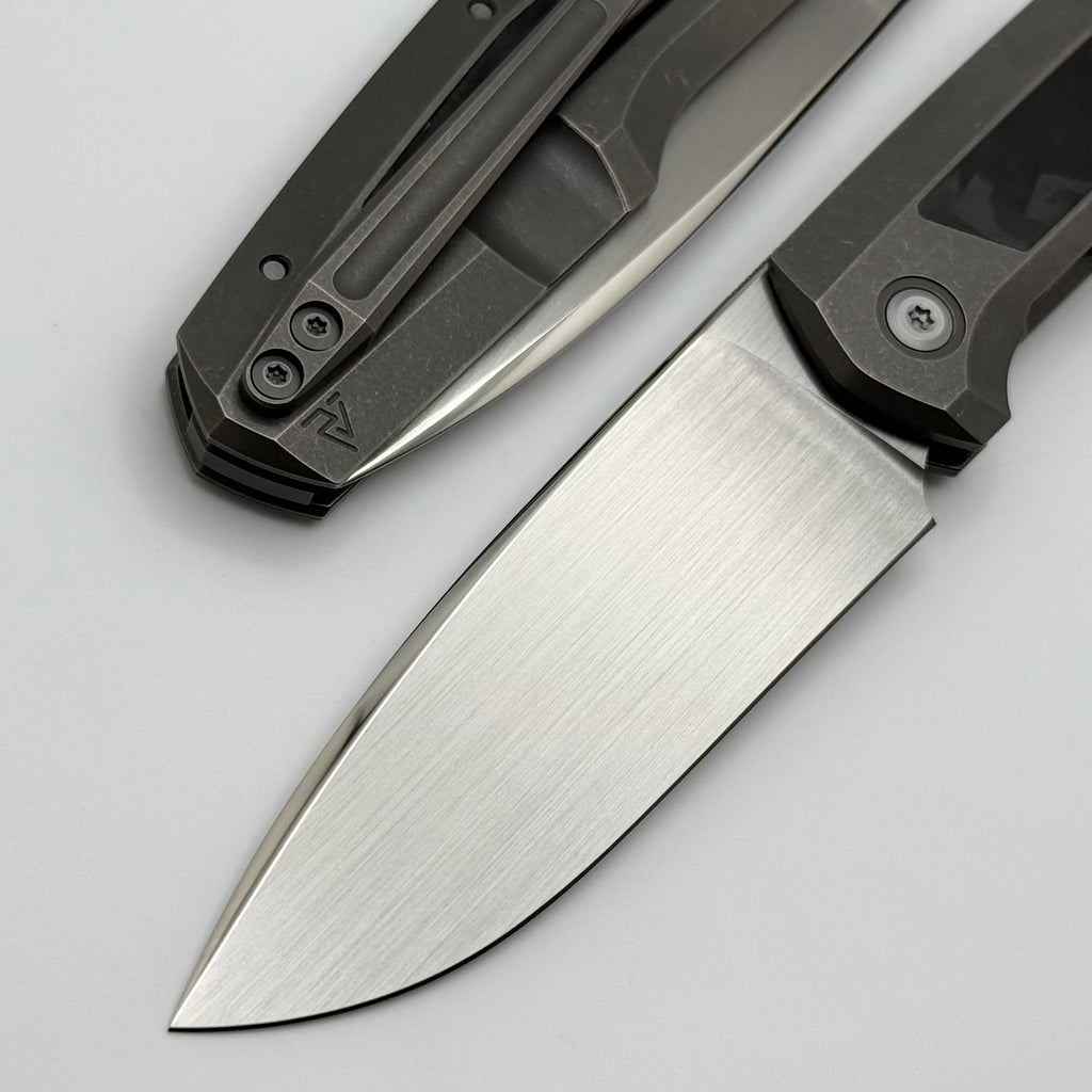 This version will have a hand satin M398 blade with a mirrored swedge and a bit darker tumbled titanium handles with a black carbon fiber inlay, think Ummu tumbled finishing handles. These will be a bit smaller than the FIF20 models were.