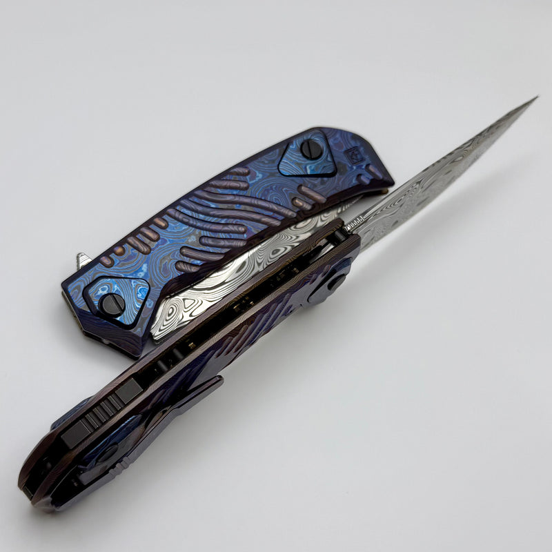 The UMMU 2! This awesome knife is designed by Aleksey Konygin and features a Damasteel blade and milled ZircuTi scales. Opens by flipper tab on a multi row bearing pivot.