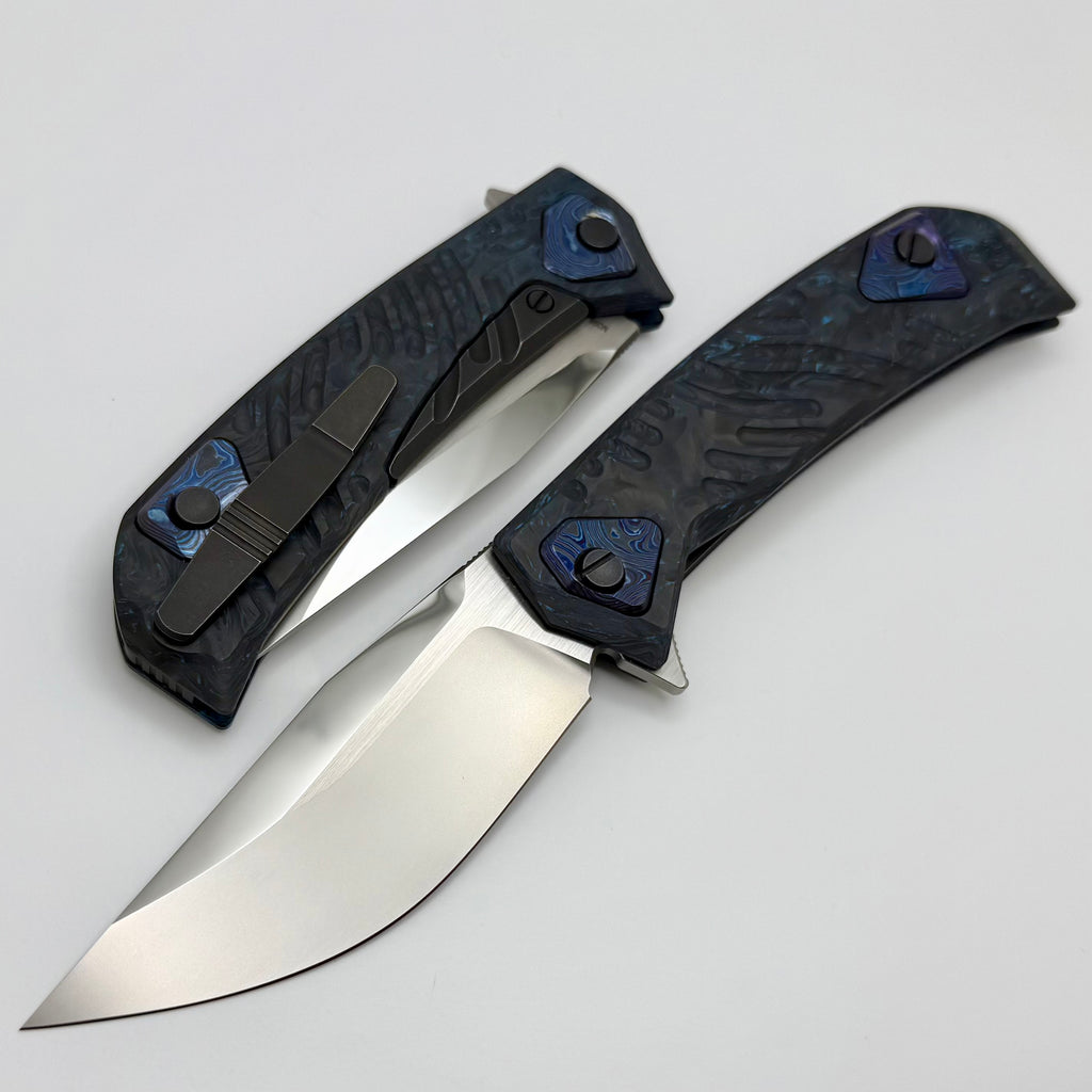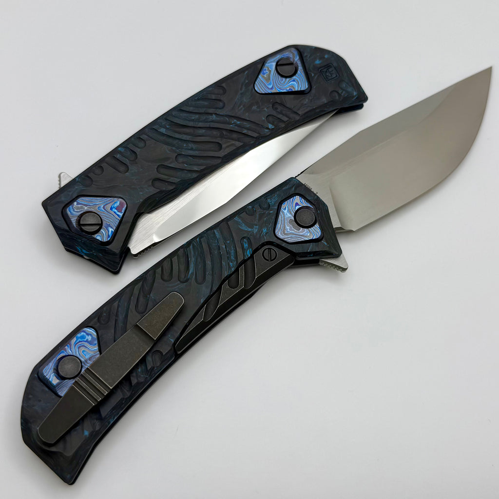 The UMMU 2! This awesome knife is designed by Aleksey Konygin and features a CKF washM398 blade with mirror swedge, milled blue carbon fiber scales & Backspacer, and ZircuTi inlays. Opens by flipper tab on a multi row bearing pivot.