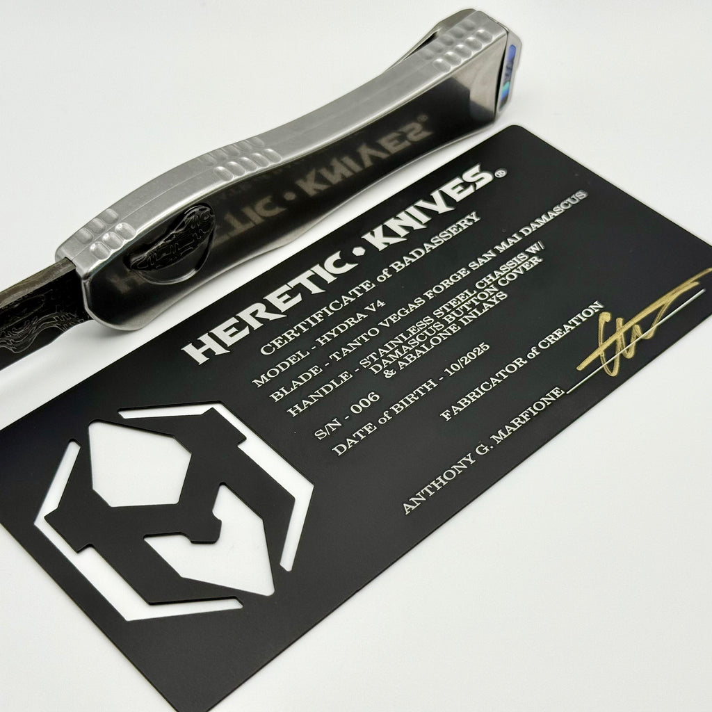 Heretic Custom Hydra V4 Stainless Steel Handle w/ Abalone Inlays & Vegas Forge San Mai Damascus Tanto