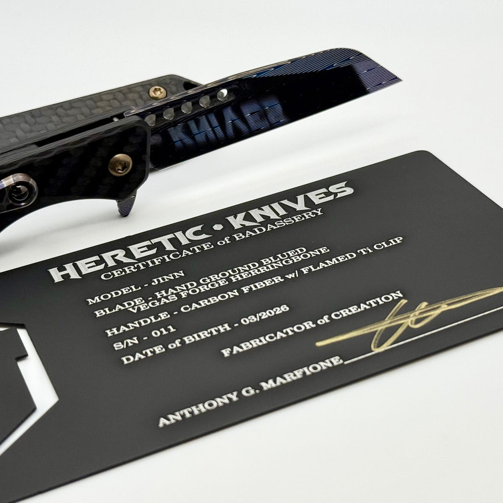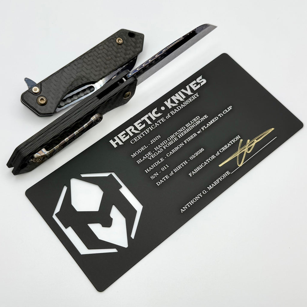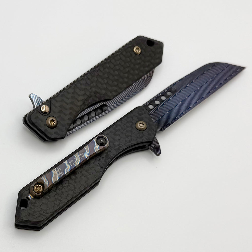 Heretic Knives Custom Jinn Flipper w/ Carbon Fiber Handles & Hand Ground Blued Damascus