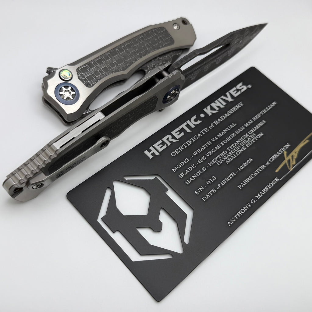 Heretic Knives Custom Wraith V4 Manual Titanium Handles w/ Damascus Inlays & Hand Ground Vegas Forge San Mai