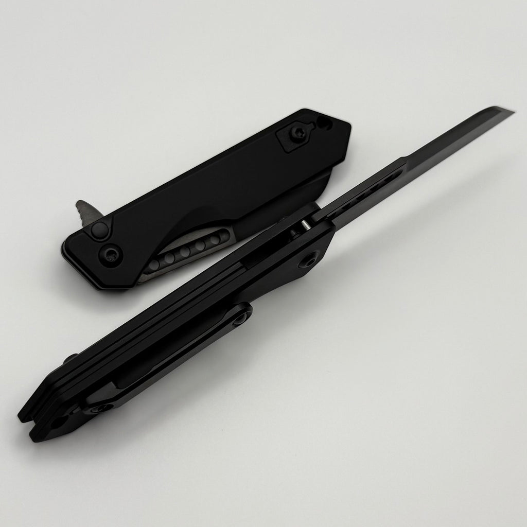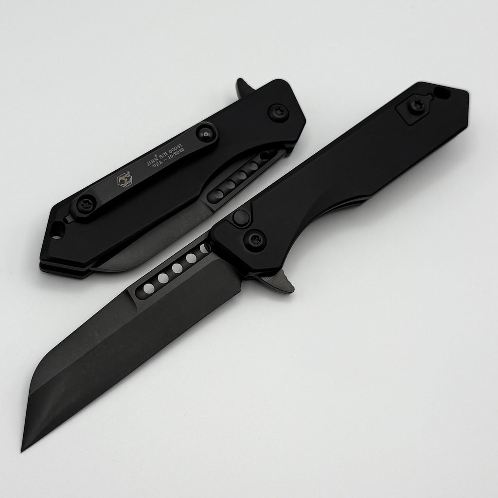 Heretic Knives M/A Jinn Flipper w/ Black Aluminum Handles & Hand Ground DLC MagnaCut