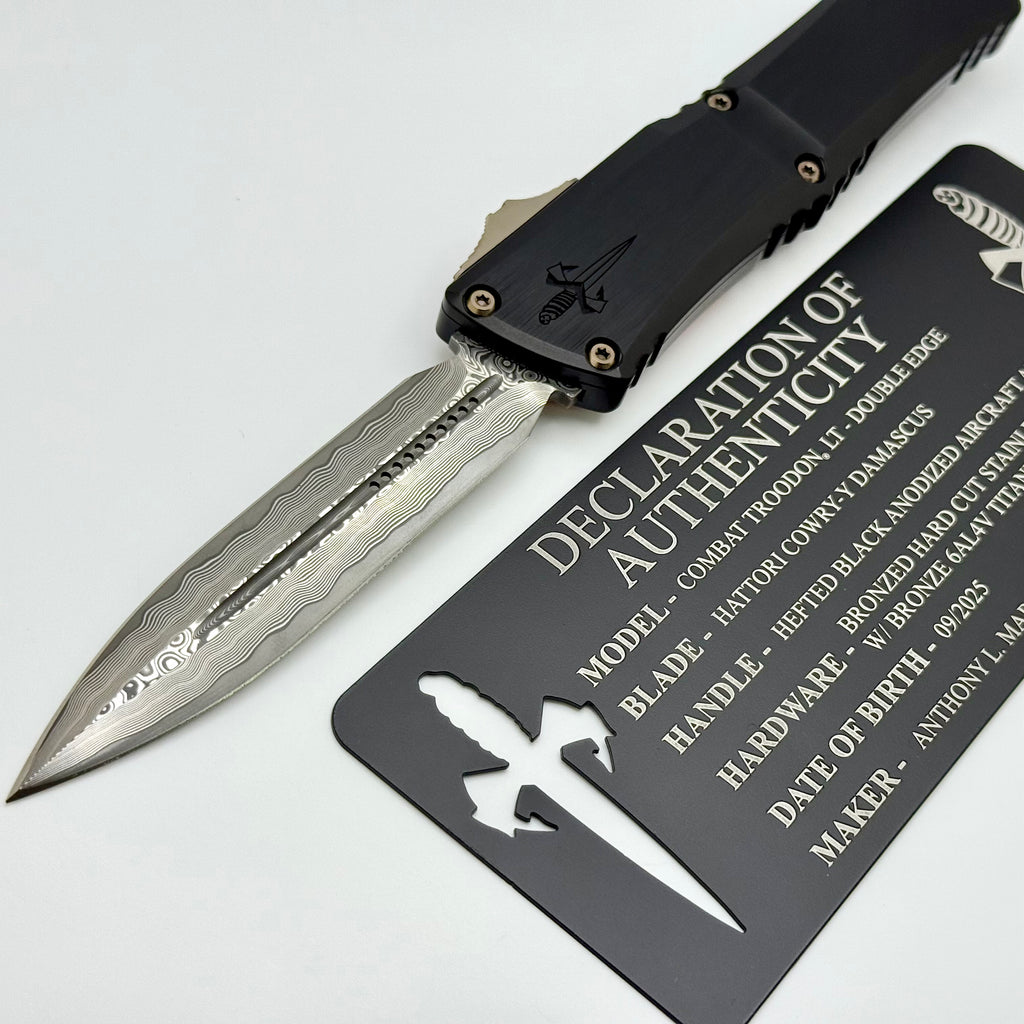Marfione Custom Knives Combat Troodon LT Gen III Hattori Cowry Damascus D/E w/ Black Hefted Handle & Bronzed Hardware