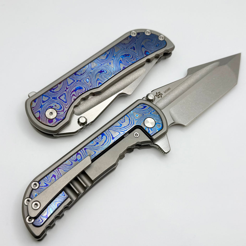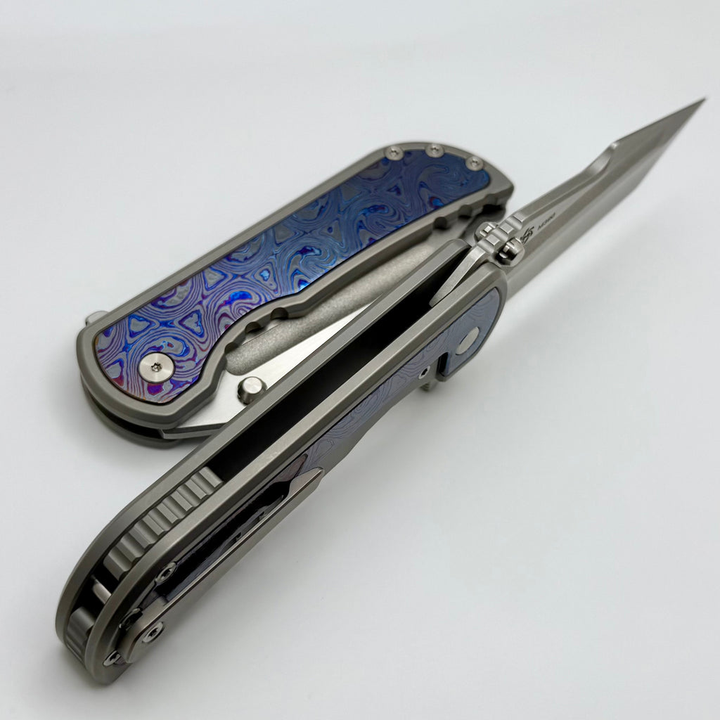 In collaboration with Alphahunter, is the production Apocalypse folder. These folders are on bearings and have great action. This model features Black Timascus inlays with black titanium handles and blue anodized hardware. Included is a hard case and sticker.