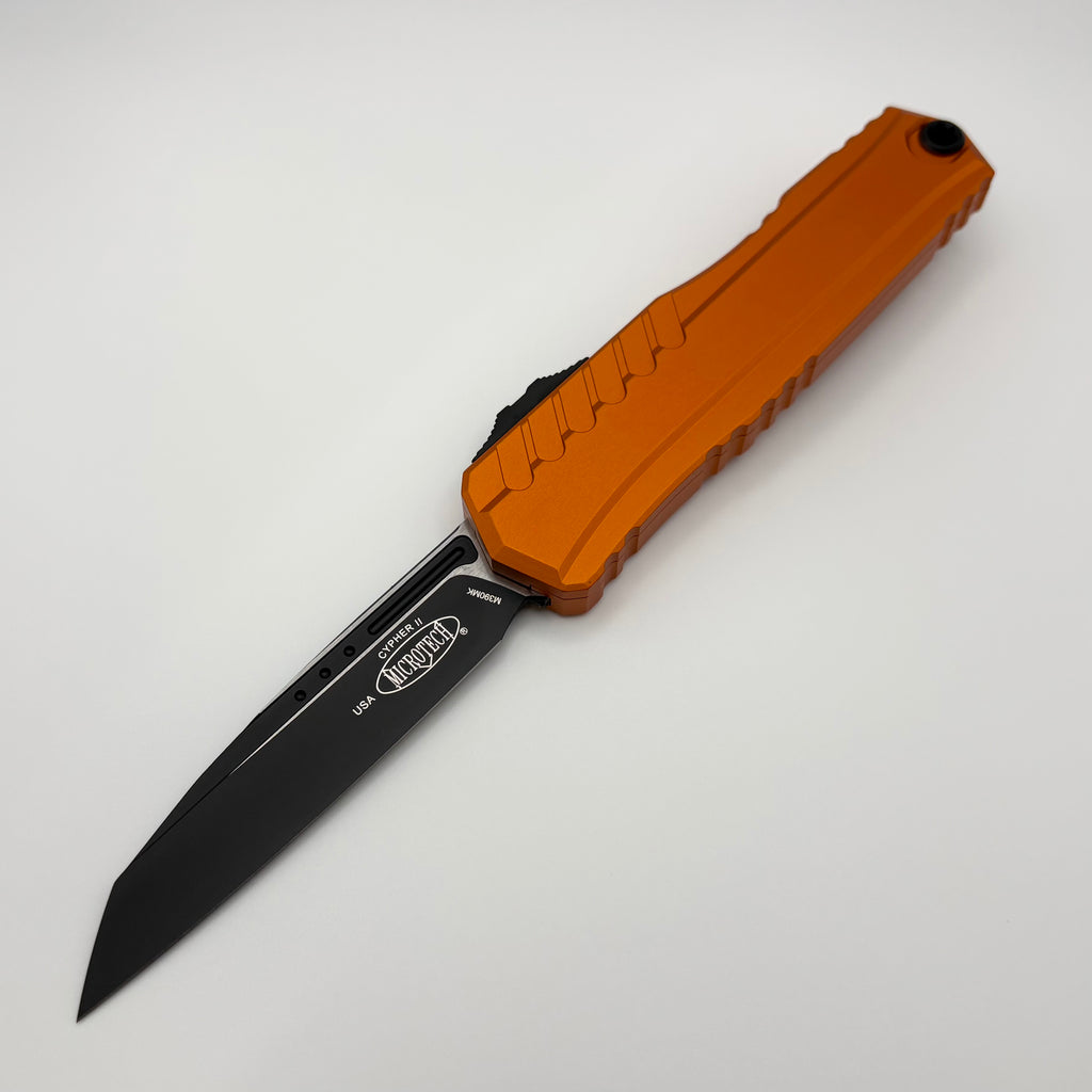 The all new Cypher II from Microtech Knives is here! Featuring a shorter handle with an integrated glass breaker and a milled titanium pocket clip. The new OTF drive system makes these knives the smoothest that Microtech has ever produced. Extremely smooth/easy opening and closing. The new switch now rides on a milled platform, this helps break up pocket lint/debris and reduces friction which increases its reliability and lowers the frequency of cleanings. The screw less handle makes for a clean fresh look. These models are completely redone and are sure to please!