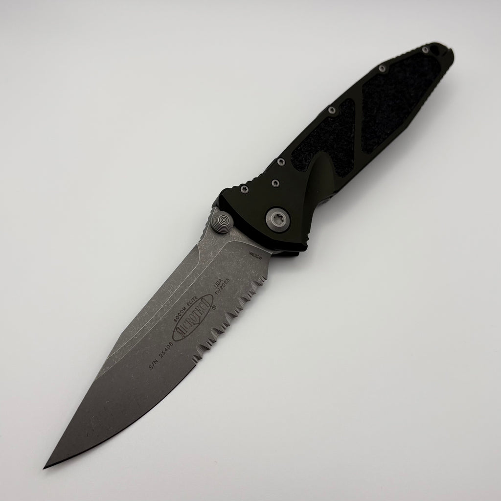 Factory Blem Microtech Socom Elite Manual S/E Apocalyptic Part Serrated & Woodlands Green Handle 160-11APWL