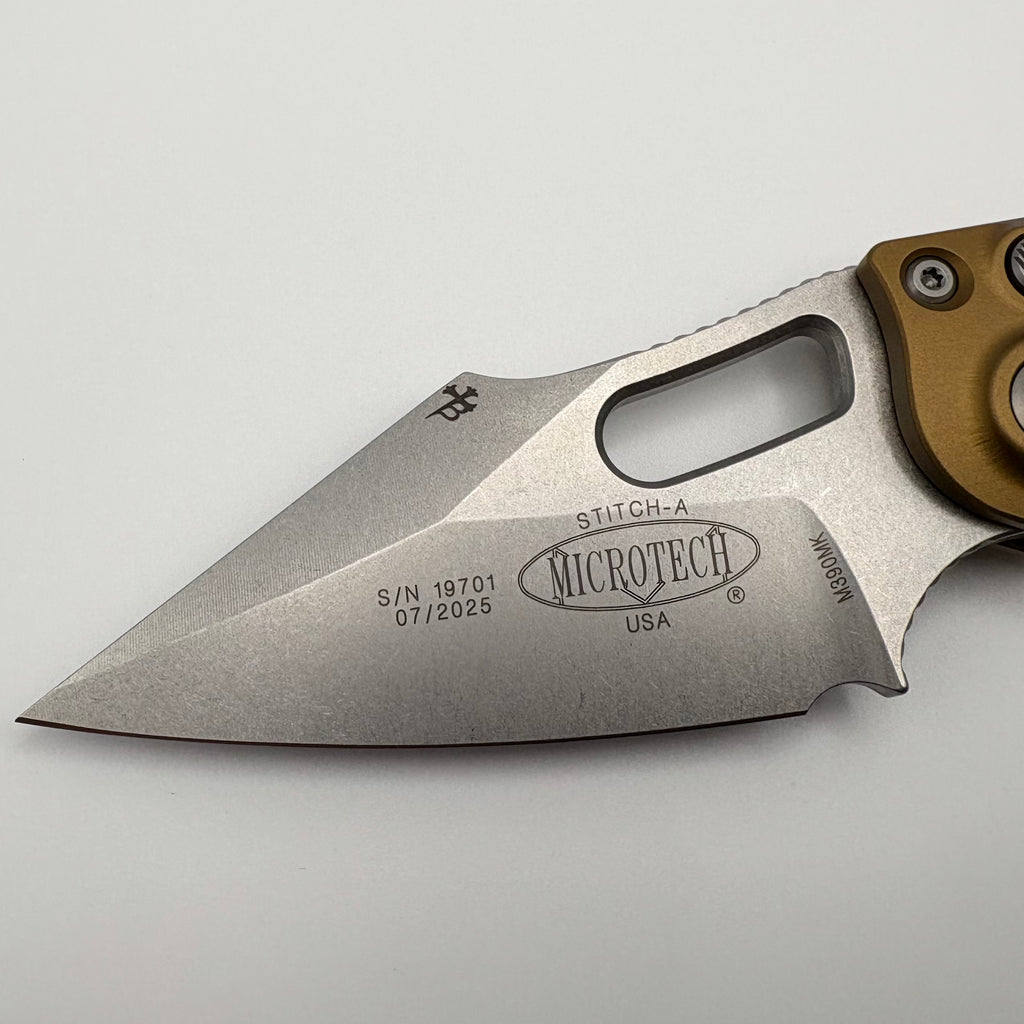 This is a new factory second blem from Microtech denoted by the grenade engraved on the blade.