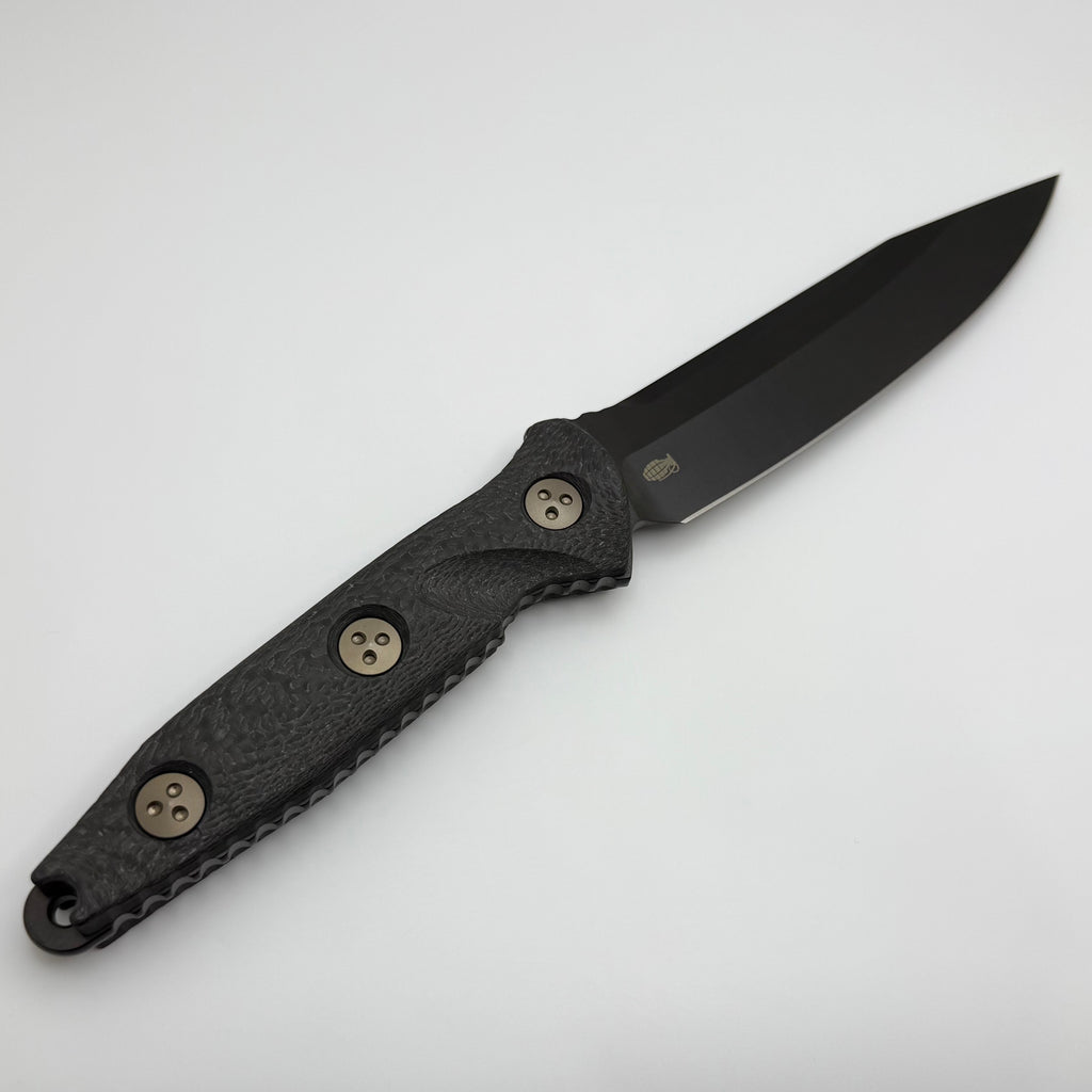 The Microtech® SOCOM Alpha®, styled after the original SOCOM folder, is a full-tang fixed blade knife. This knife has a carbon fiber handle and comes equipped with a Carbon fiber sheath. The SOCOM Alpha® is an impressive and unparalleled tactical knife.