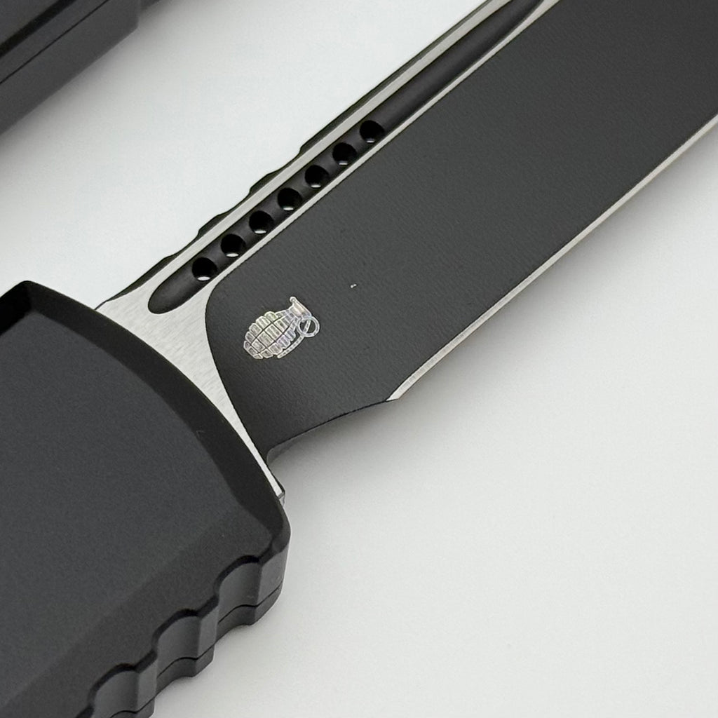 This is a new factory second blem from Microtech denoted by the grenade engraved on the blade.
