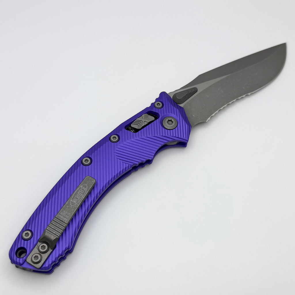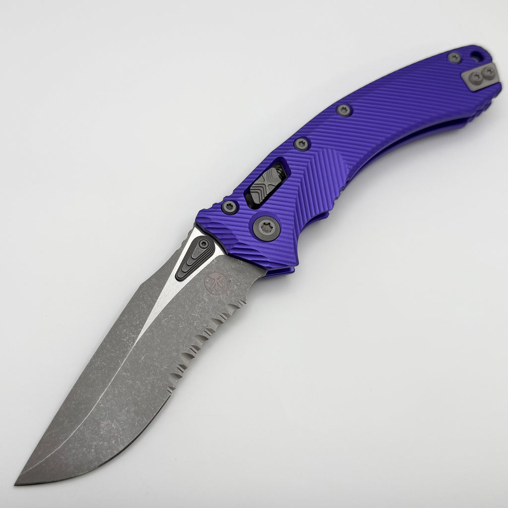 Microtech Amphibian RAM LOK Purple Fluted Aluminum & Apocalyptic Partial Serrated M390MK 137RL-11APFLPU