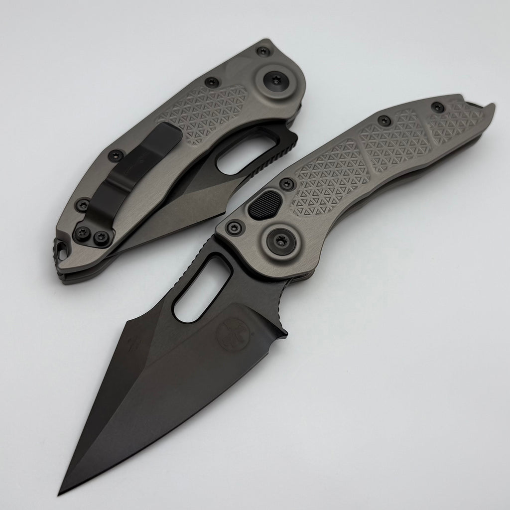 The Microtech Stitch is a production version of the custom knife collaboration between Marfione and Borka Blades. This model features a spear point style blade, substantial choil and thumb ramp, and a knurled alloy handle with a black finish. Most of our Stitch knives come fitted with bead blasted hardware unless DLC or Tactical, and a secure right-hand, tip-up carry pocket clip.