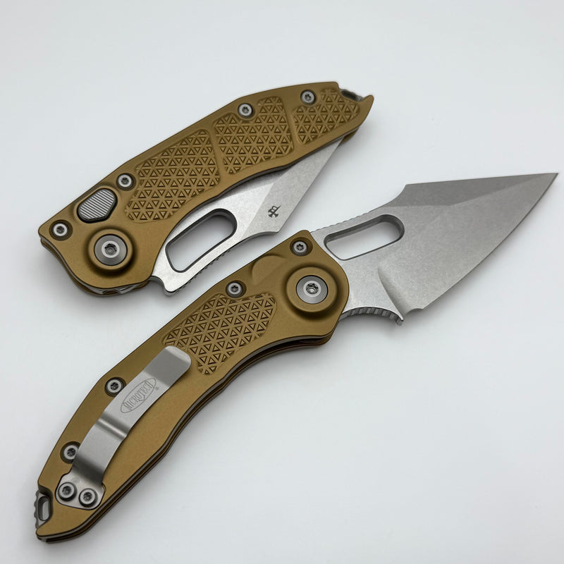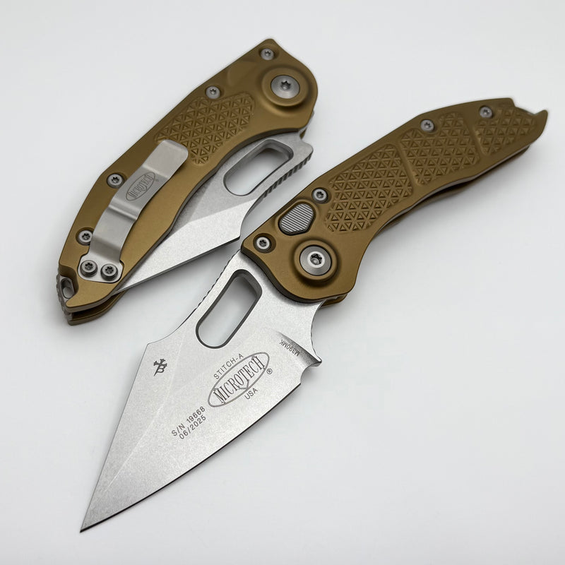 The Microtech Stitch is a production version of the custom knife collaboration between Marfione and Borka Blades. This model features a spear point style blade, substantial choil and thumb ramp, and a knurled alloy handle with a black finish. Most of our Stitch knives come fitted with bead blasted hardware unless DLC or Tactical, and a secure right-hand, tip-up carry pocket clip.