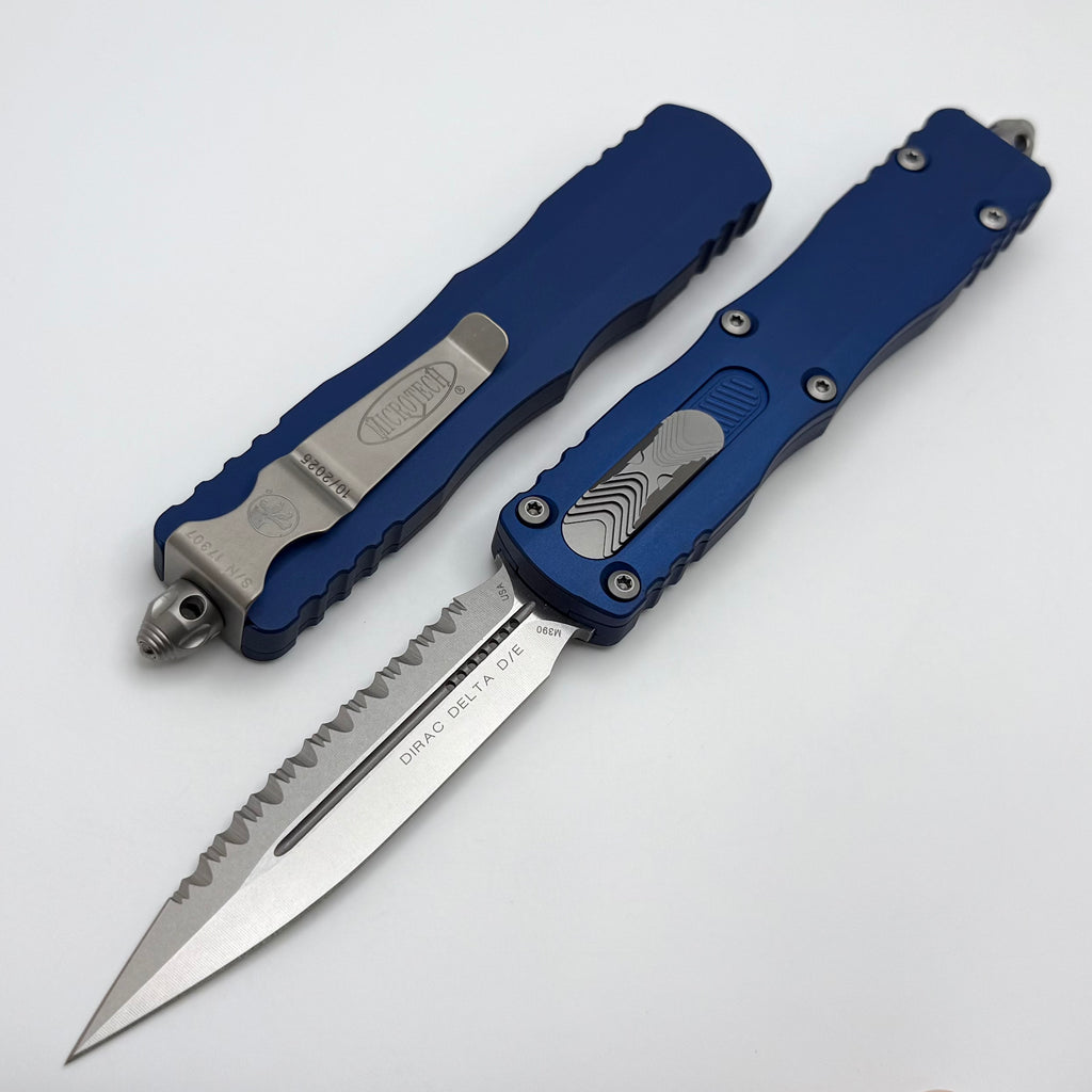 Microtech Dirac Delta D/E Full Serrated Stonewash w/ Navy Blue Handles 227-12NA