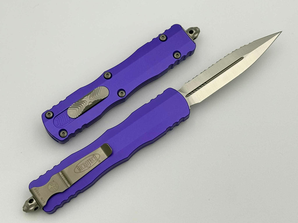 Microtech Dirac Delta D/E Satin Full Serrated w/ Purple Handle 227-6PU