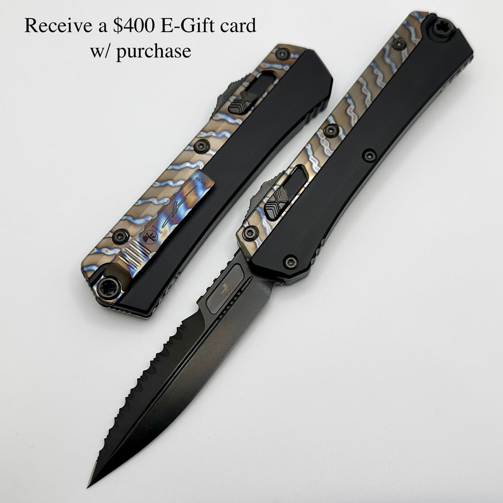 One of the latest special releases from Microtech, as well as one of our favorite finishes, the Flamed & DLC Glykon Series! The titanium accents were polished and then hand flamed by Tony Marfione! These feature a black aluminum handle with flamed titanium overlays and accents. As well as a DLC part serrated blade and DLC hardware.