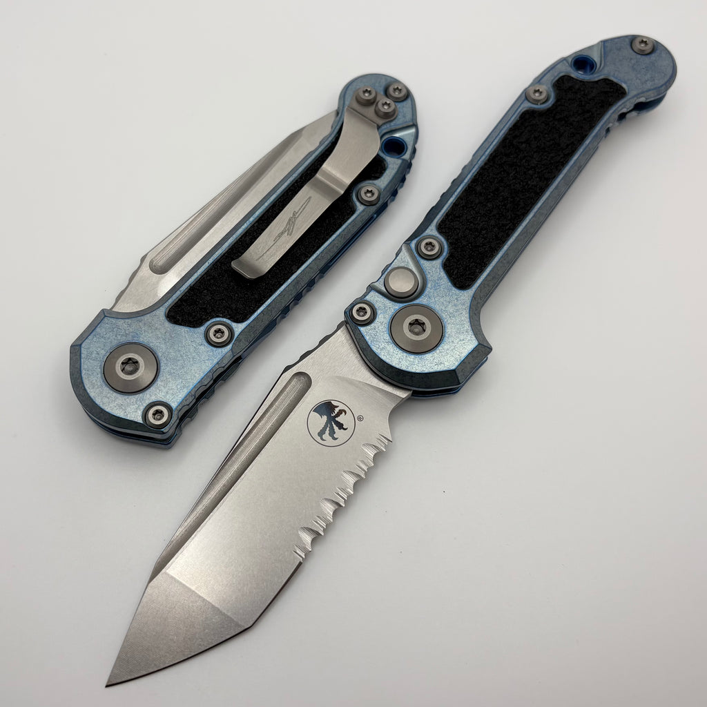 Microtech Marfione Select LUDT Gen III Ice Blue Textured Inlaid Titanium Handles w/ Blue Accents & Stonewash Part Serrated Tanto 1136-11MS12