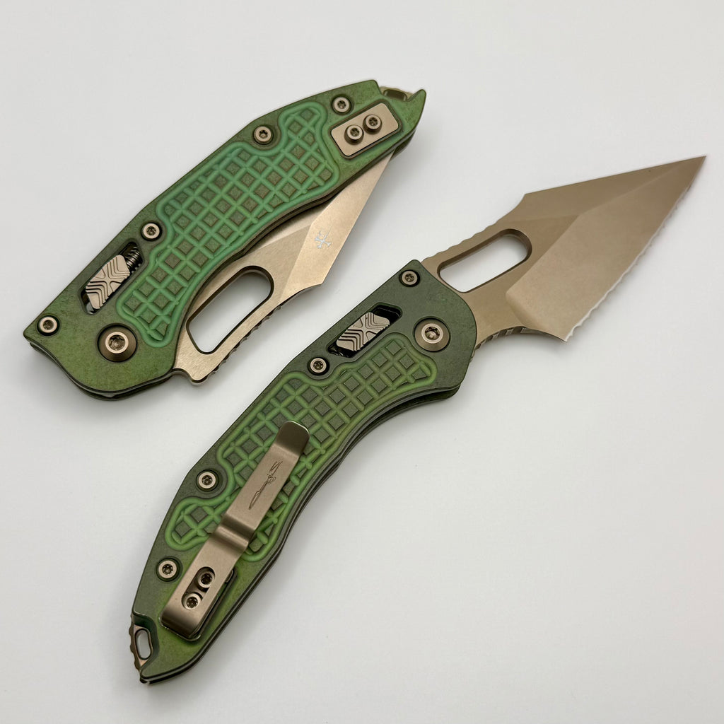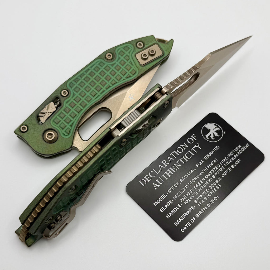 Microtech Marfione Select Manual Stitch RAM LOK Antique Green Frag Titanium Handles & Bronze Full Serrated M390MK 169RL-15FRMS1