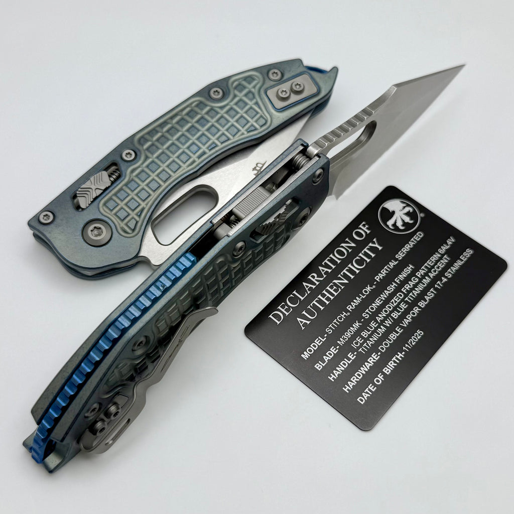 Microtech Marfione Select Manual Stitch RAM LOK Ice Blue Titanium Frag Handles & Part Serrated Stonewash M390MK w/ Double Vapor Blast/Blue Accents 169RL-11FRMS6