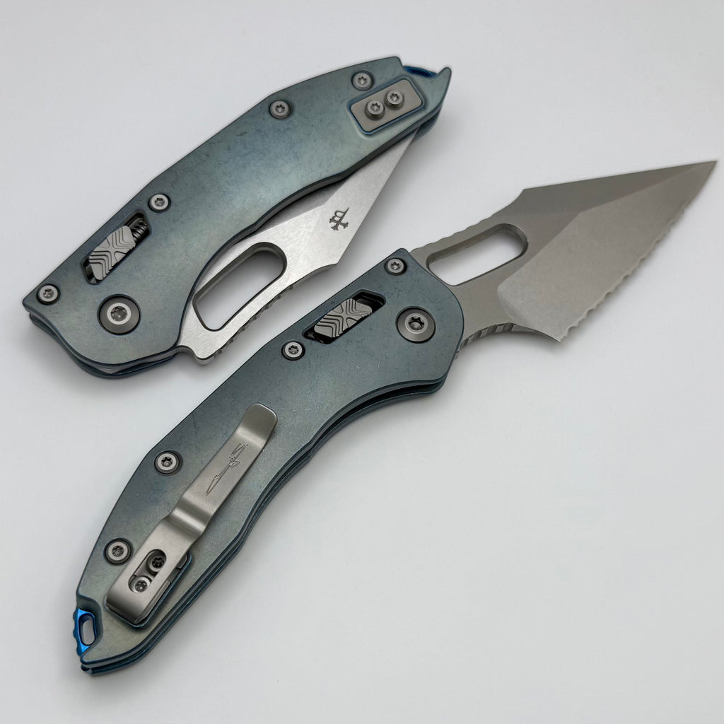 Microtech Marfione Select Manual Stitch RAM LOK Ice Blue Titanium Handles & Stonewash Full Serrated M390MK w/ Double Vapor Blast/Blue Accents 169RL-12MS6