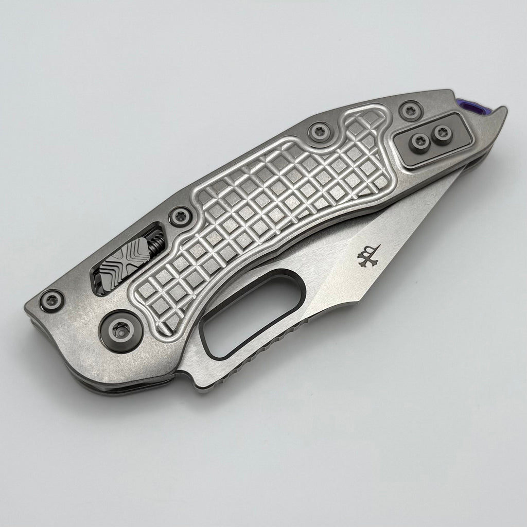 Microtech Marfione Select Manual Stitch RAM LOK Titanium Frag Handles & Part Serrated Stonewash M390MK w/ Double Vapor Blast & Purple Accents 169RL-11FRMS3