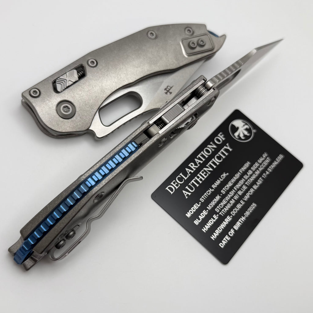 Microtech Marfione Select Manual Stitch RAM LOK Titanium Handles & Part Serrated Stonewash M390MK w/ Double Vapor Blast & Blue Accents 169RL-11MS2