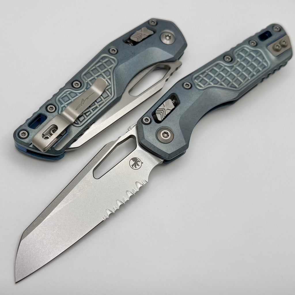 Microtech Marfione Select MSI RAM LOK Ice Blue Titanium Frag Handles w/ Double Vapor Blast & Blue Accents & Part Serrated Stonewash M390MK 210-11FRMS6