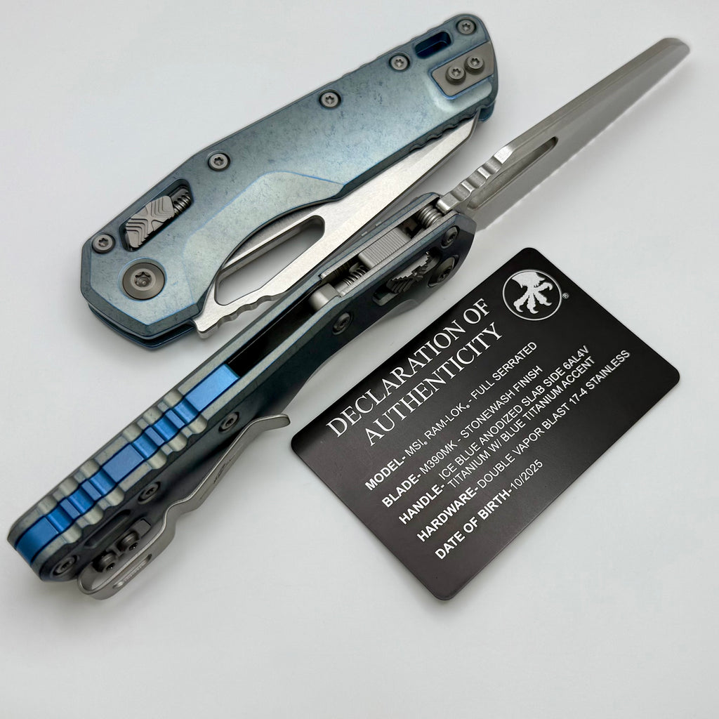 Microtech Marfione Select MSI RAM LOK Ice Blue Titanium Handles w/ Double Vapor Blast & Purple Accents & Full Serrated Stonewash M390MK 210-12MS6