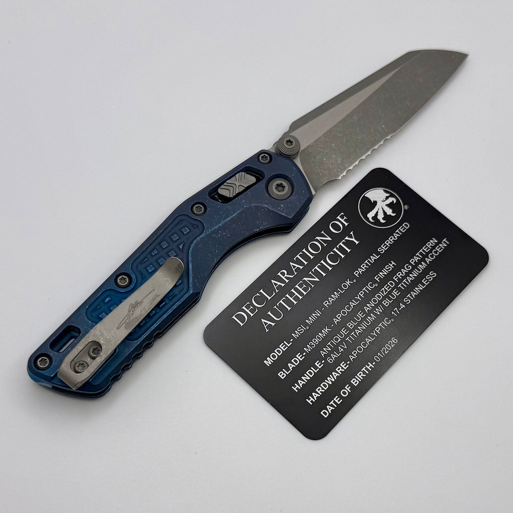 Microtech Marfione Select MSI RAM LOK Antique Blue Mini Frag Titanium Handles w/ Blue Accents & Apocalyptic Part Serrated M390MK 210M-11APFRMS2