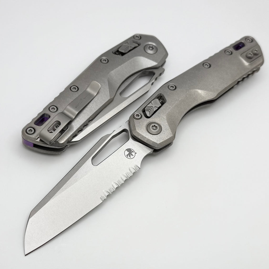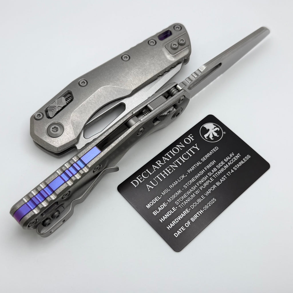 Microtech Marfione Select MSI RAM LOK Titanium Handles w/ Double Vapor Blast & Purple Accents & Part Serrated Stonewash M390MK 210-11MS3