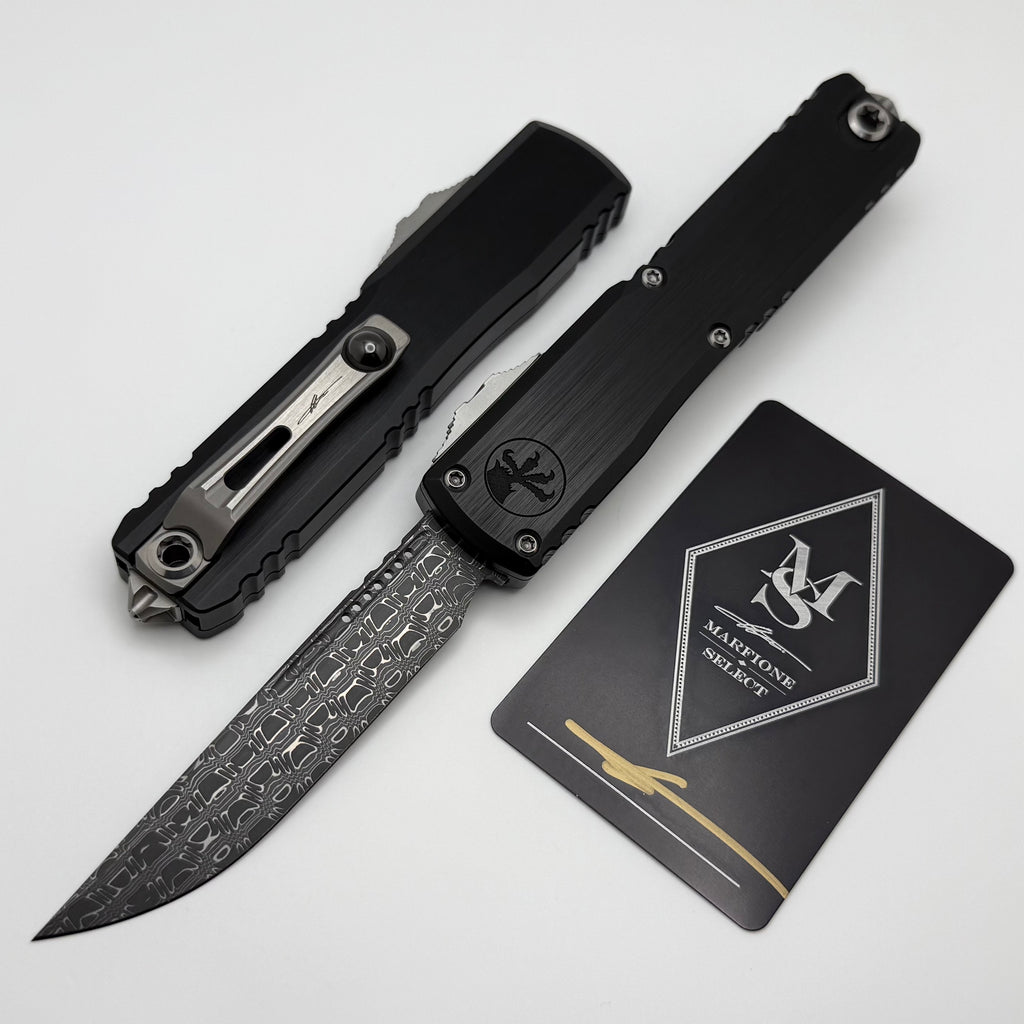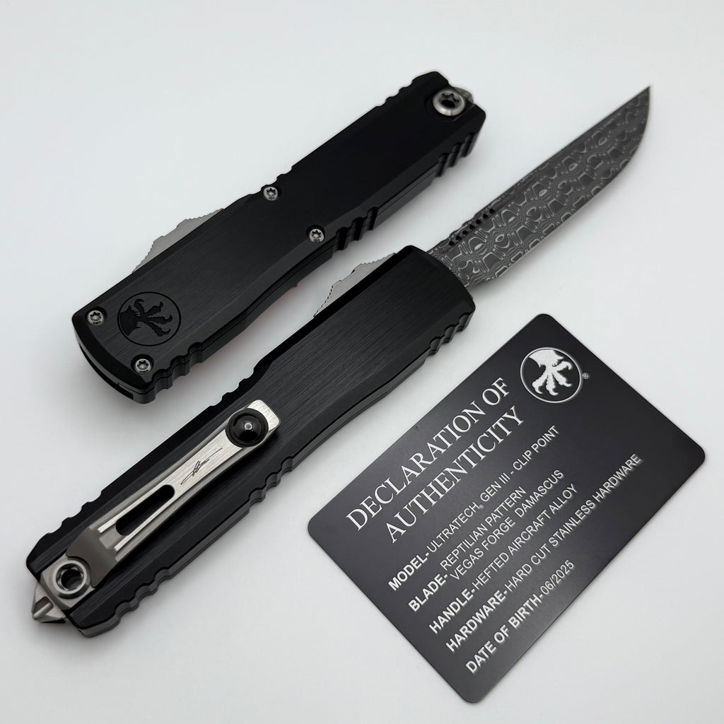 Microtech Marfione Select Ultratech ZBP S/E Vegas Forge Reptilian Damascus Clip Point w/ Hefted Black Handle & DLC Accents 1121-16MS4