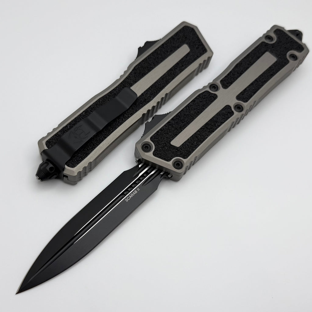 The newly revised Scarab II from Microtech Knives is here! The design of the handle grip tape inlays has been changed from the previous generation. The new OTF drive system makes these knives the smoothest that Microtech has ever produced. Extremely smooth/easy opening and closing. The new switch now rides on a milled platform, this helps break up pocket lint/debris and reduces friction which increases its reliability and lowers the frequency of cleanings. It now features M390MK blade steel. These models are completely redone and are sure to please!
