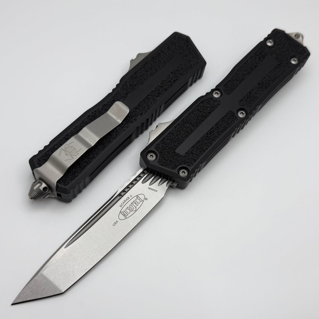 The newly revised Scarab II from Microtech Knives is here! The design of the handle grip tape inlays has been changed from the previous generation. The new OTF drive system makes these knives the smoothest that Microtech has ever produced. Extremely smooth/easy opening and closing. The new switch now rides on a milled platform, this helps break up pocket lint/debris and reduces friction which increases its reliability and lowers the frequency of cleanings. It now features M390MK blade steel. These models are completely redone and are sure to please!