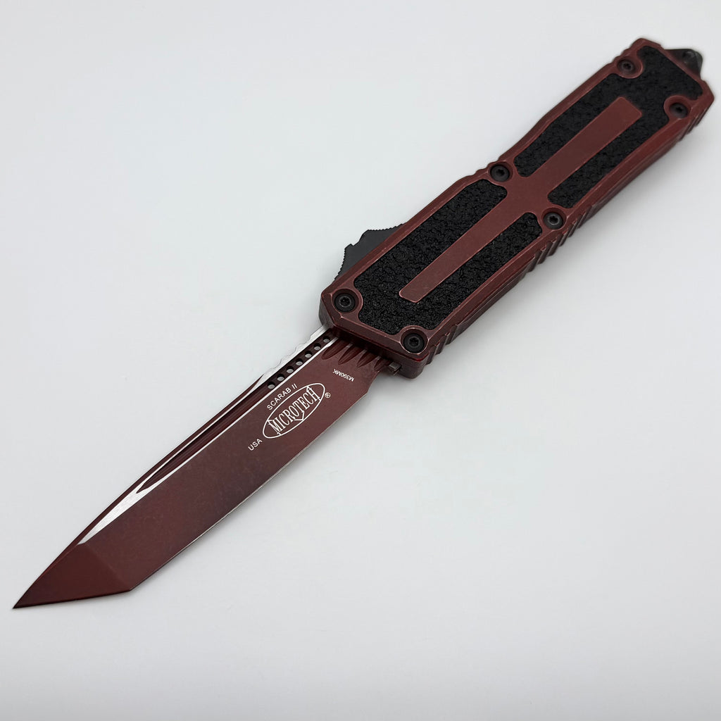 The newly revised Scarab II from Microtech Knives is here! The design of the handle grip tape inlays has been changed from the previous generation. The new OTF drive system makes these knives the smoothest that Microtech has ever produced. Extremely smooth/easy opening and closing. The new switch now rides on a milled platform, this helps break up pocket lint/debris and reduces friction which increases its reliability and lowers the frequency of cleanings. It now features M390MK blade steel. These models are completely redone and are sure to please!