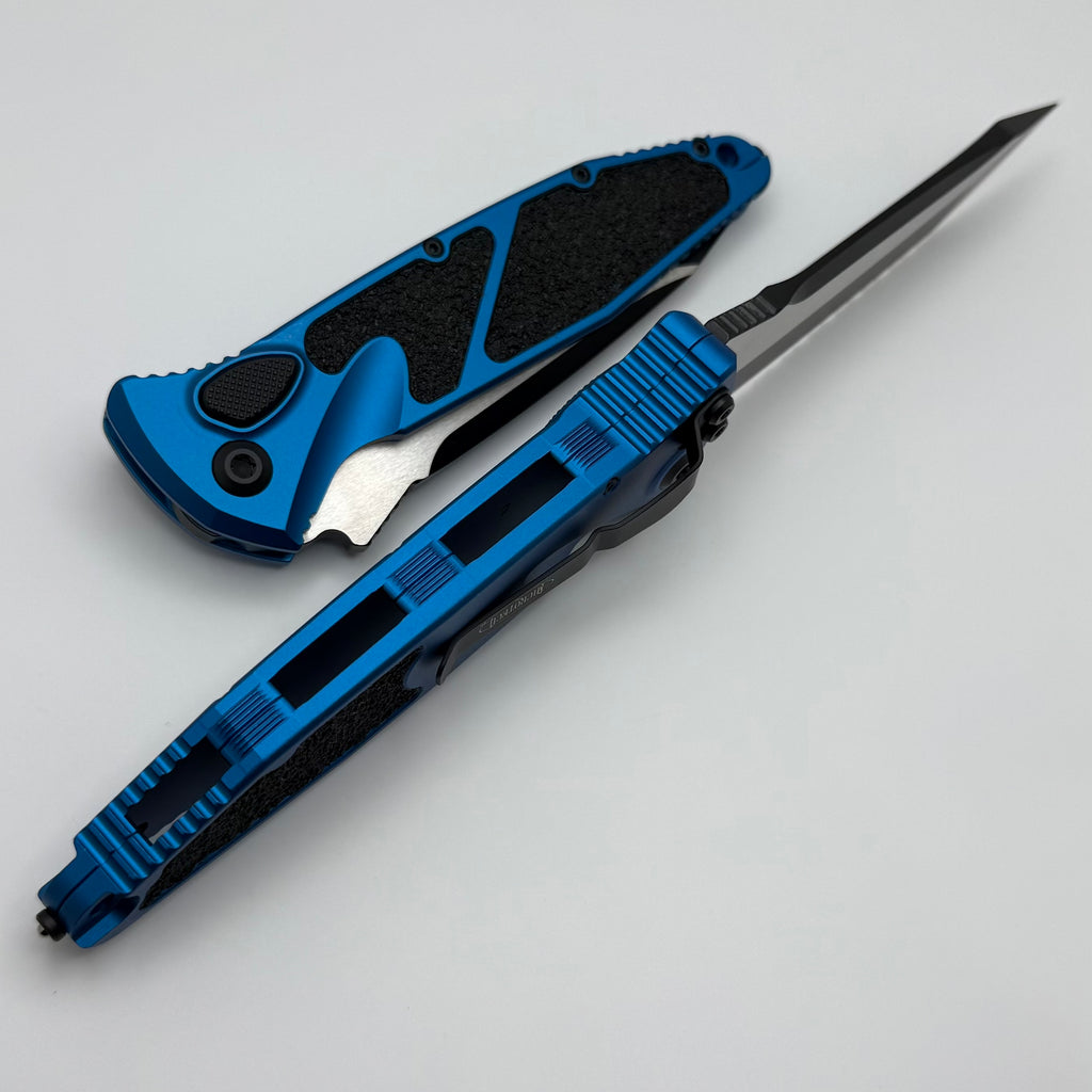 Microtech Socom Elite Auto T/E Black Full Serrated w/ Blue Handles 161A-3BL