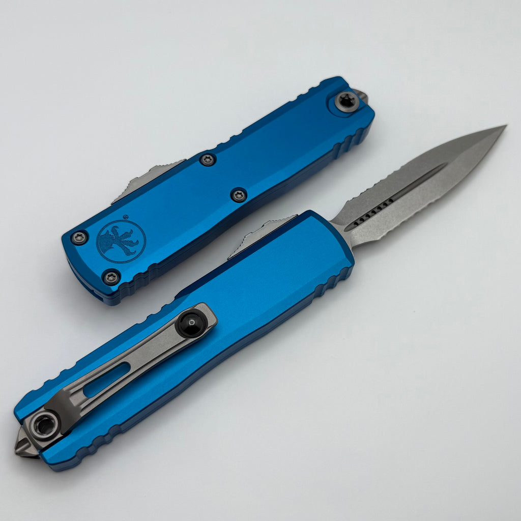 Microtech UTX-85 Gen III w/ Blue Handle & Stonewash Part Serrated D/E M390MK 1232-11BL