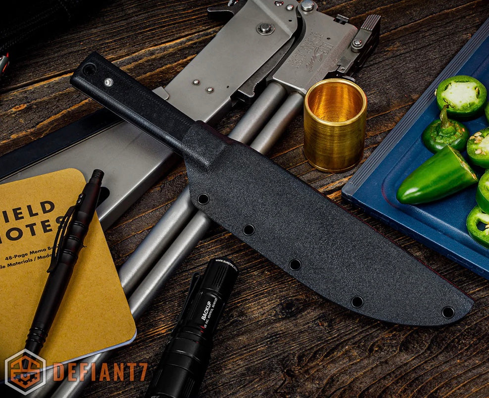 The Magnolia is from AEBL stainless steel, offering a high level of toughness, great edge retention and possibly most important, it is fairly easy to sharpen while away from home.  A knife away from home is no good if you can't put a field expedient edge on it.  The blades are stonewashed for an easy to maintain finish.  The Magnolia has black G10 handles that offer a sure grip.  Each knife includes a kydex edge cover so it can be stowed away in your camp kitchen.
