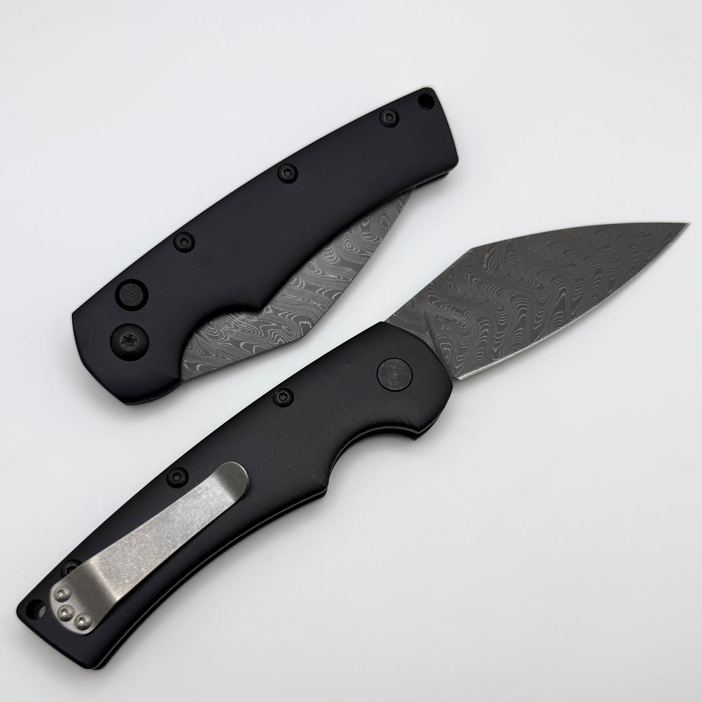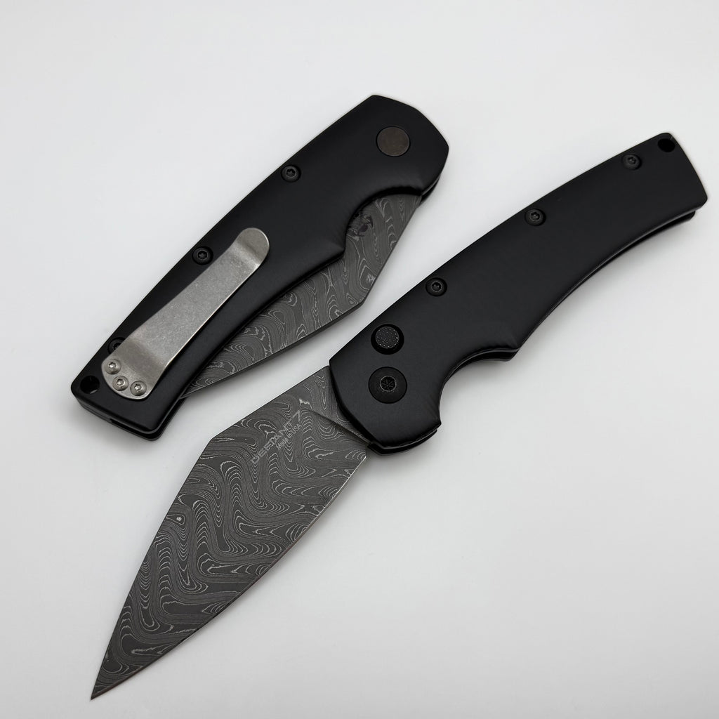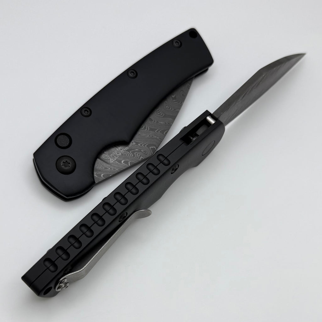 When we approached Ryan for his first folder design, he simply replied "I like Seax".  Us too, so here we are!  The Seax is a button-lock auto, that fits perfectly in your EDC rotation. Seax are constructed with 3D contoured, 6061 aluminum handles with a rich, black hard-coat anodized finish with a light machined texture for a sure grip.  Each knife features a titanium pocket clip for tip up carry.  The 3.5" Stainless Boomerang Damascus blade is composed of AEB-L, 440c, pure nickel, and 304 so it is built to work, it's not just for looks! Weighing in at only 4.4 ounces, this is one knife you won't leave at home!
