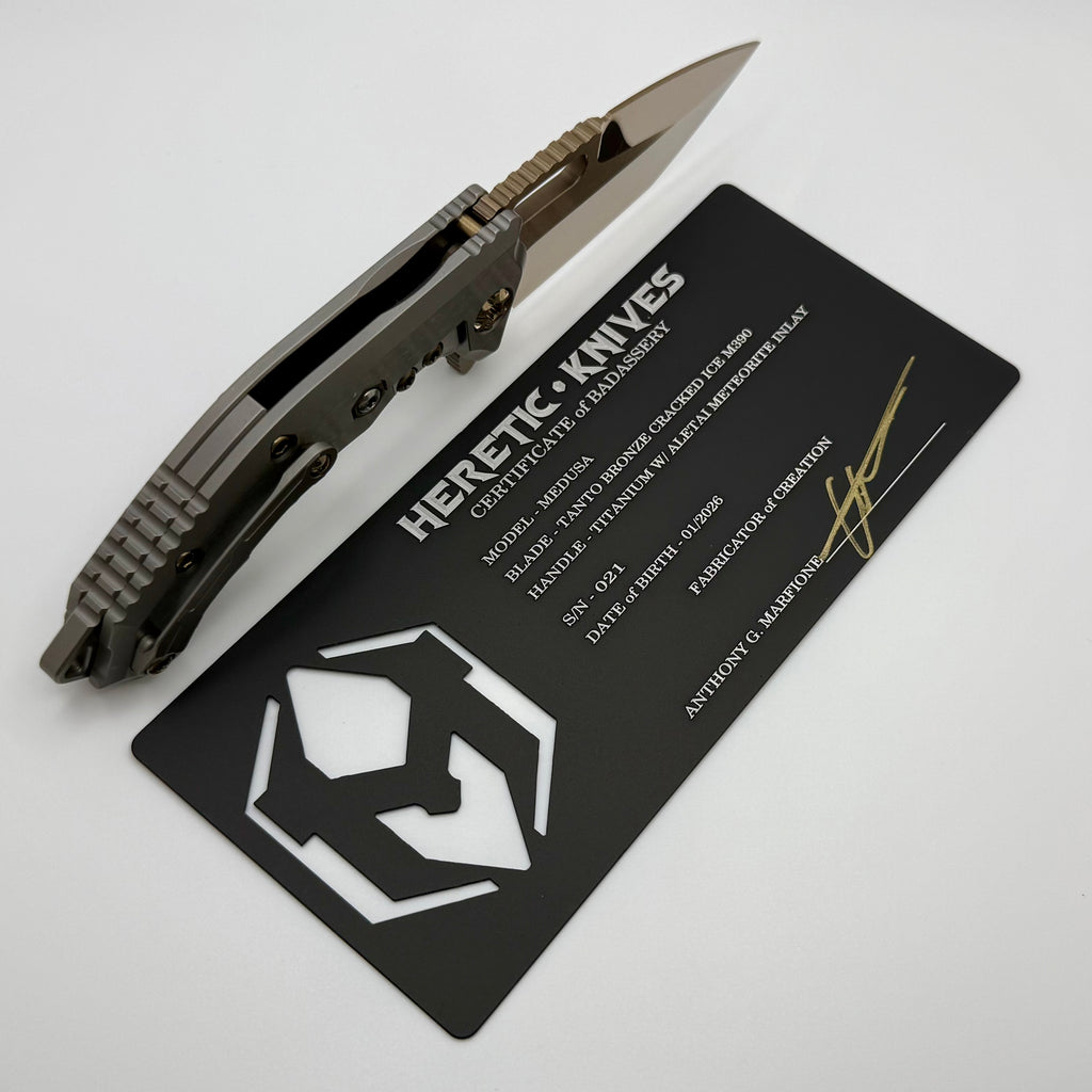 Heretic Custom Medusa M/A Titanium w/ Aletai Meteorite Inlays & Bronze Cracked Ice Tanto M390