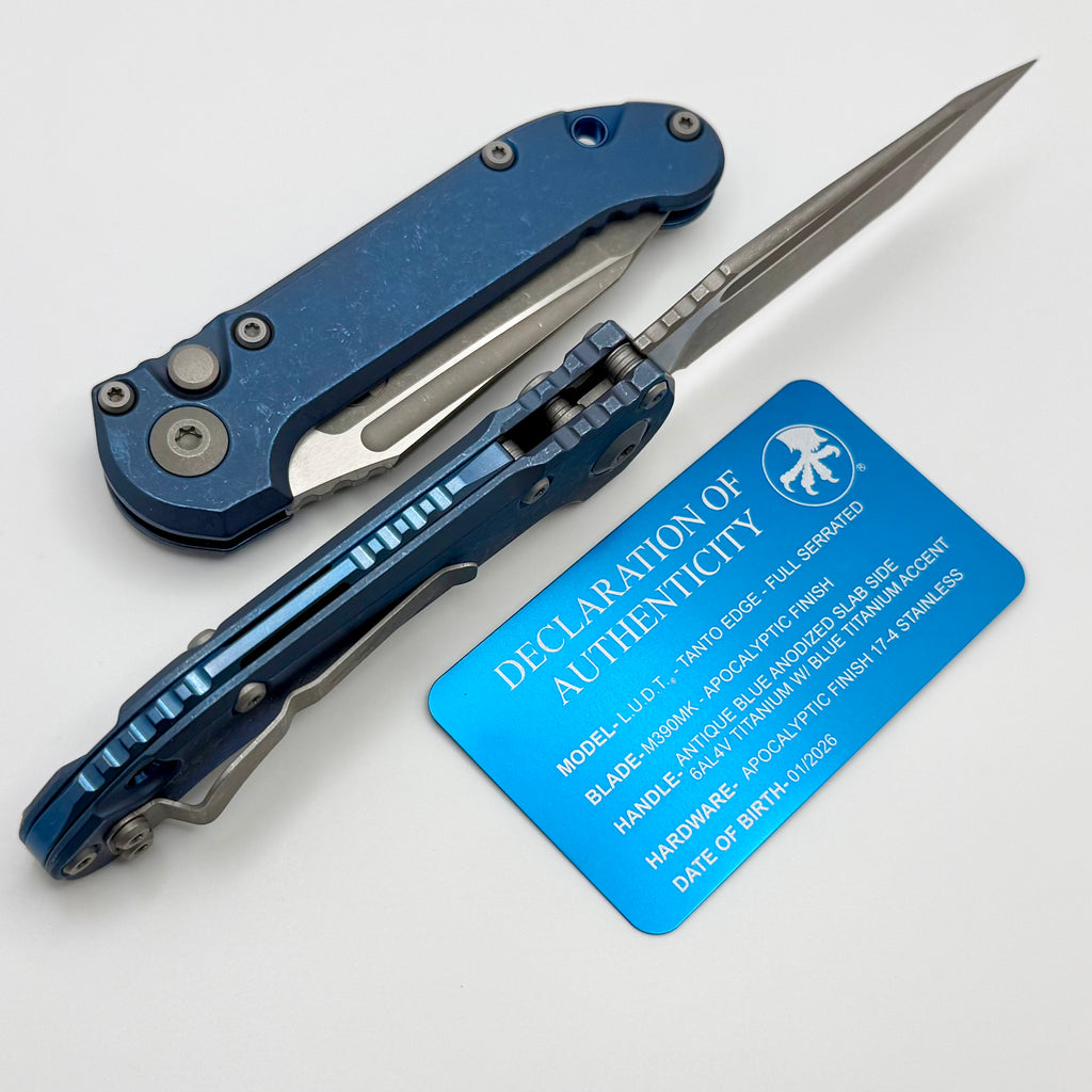 Microtech Marfione Select LUDT Gen III Antique Blue Slab Side Titanium Handles w/ Blue Accents & Full Serrated Apocalyptic Tanto 1136-12APMS3