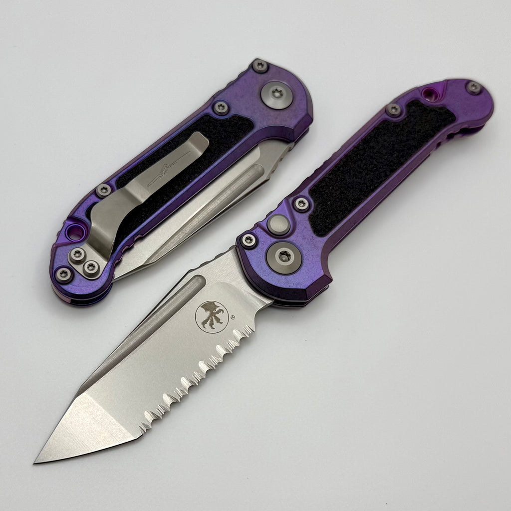 Microtech Marfione Select LUDT Gen III Purple Haze Textured Inlaid Titanium Handles w/ Purple Accents & Stonewash Full Serrated Tanto 1136-12MS10