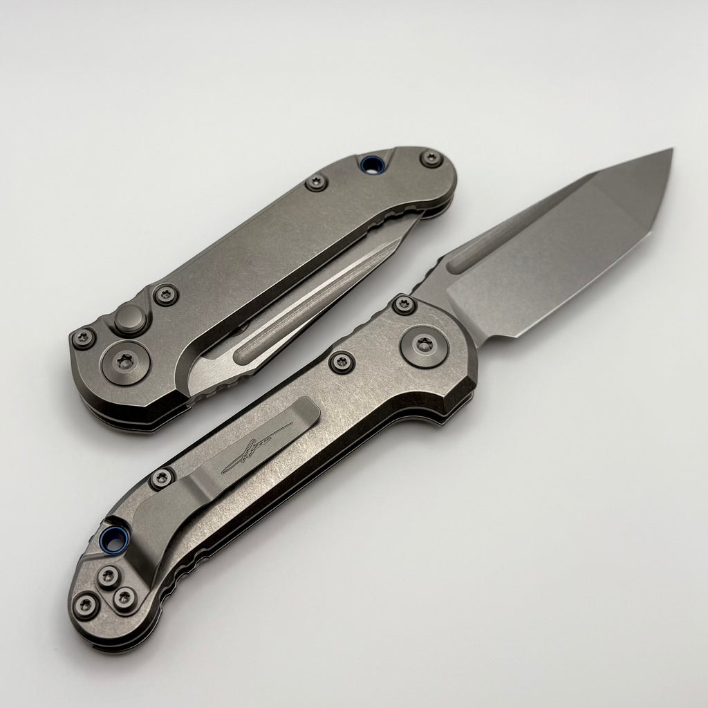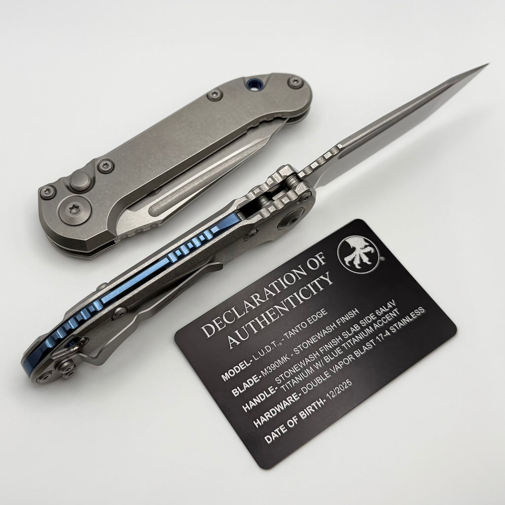 Microtech Marfione Select LUDT Gen III Slab Side Titanium Handles w/ Blue Accents & Stonewash Tanto 1136-10MS3