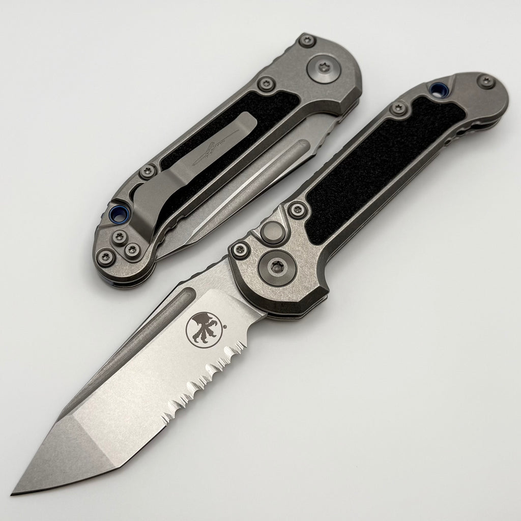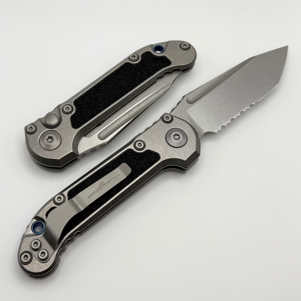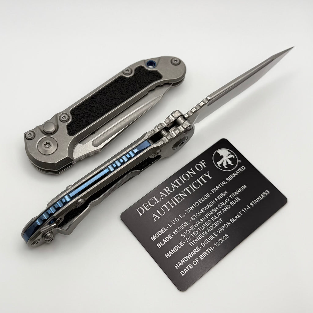 Microtech Marfione Select LUDT Gen III Titanium w/ Textured Inlaid Handles w/ Blue Accents & Stonewash Part Serrated Tanto 1136-11MS4