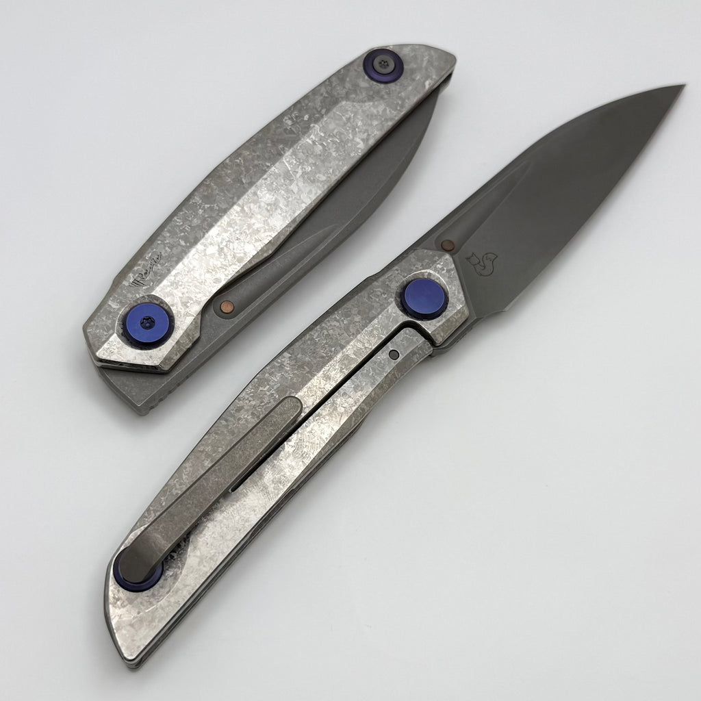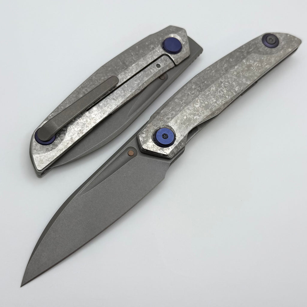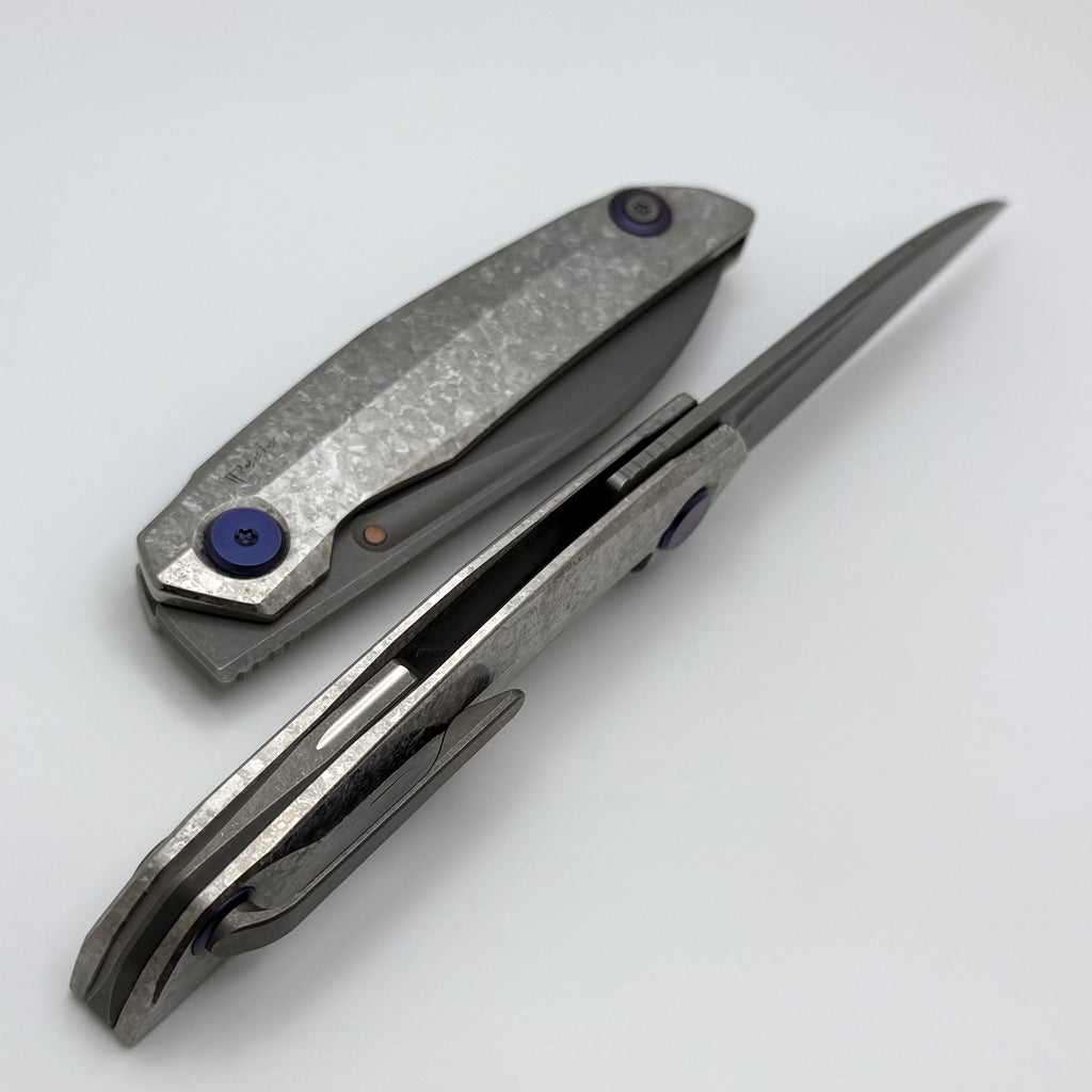 Reate Knives VK-ANUB Crystal Titanium Handles w/ Blue Accents & Darkwash Elmax