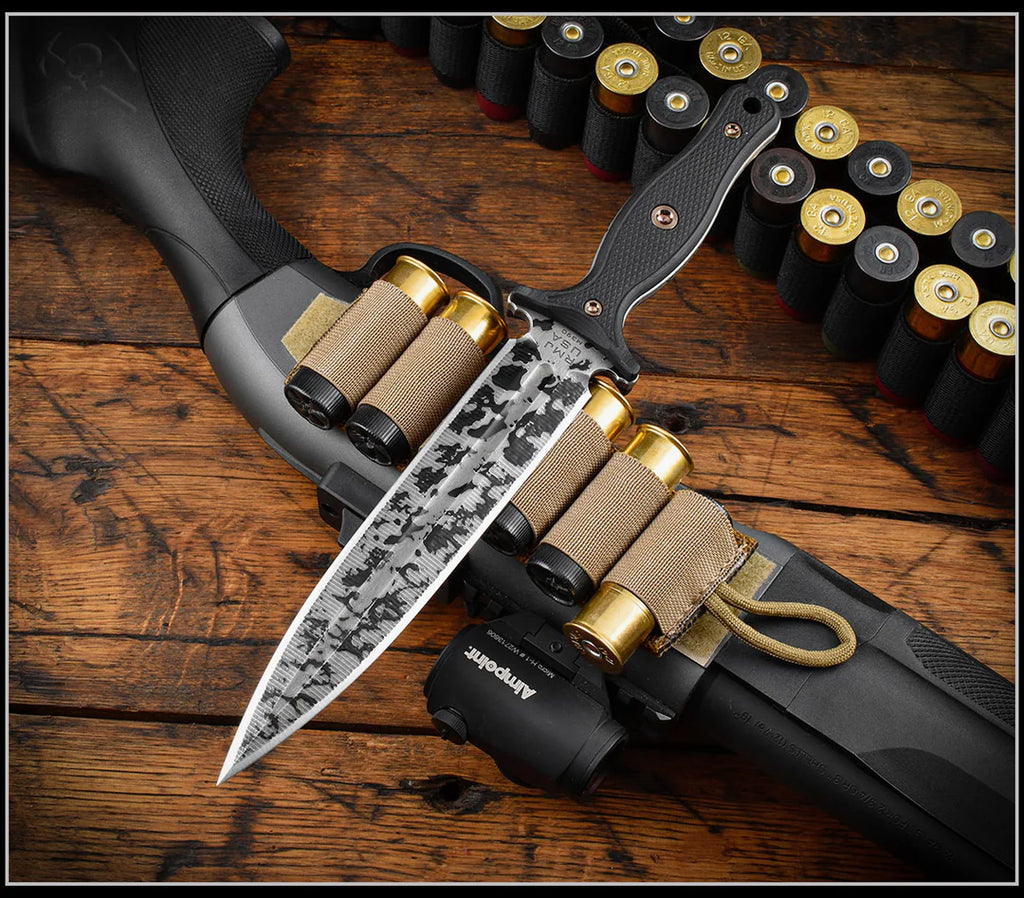 Kilroy is another classic double-edge military fighter from Ryan's sketchbook, drawing heavy inspiration from our Trench Raider knuckle knife but without the guard.  The Kilroy has an overall length of 11 3/8” and has a 7 3/16" M390 stainless steel double-edge dagger blade featuring a tapered fuller down the center.  The checkered G10 handles are secured with Grade 5 Titanium fasteners that are electro-anodized in bronze to round out the look.  Kilroy includes a ambidextrous kydex sheath that can be worn on a belt or mounted to PALS webbing on a wide variety of gear.