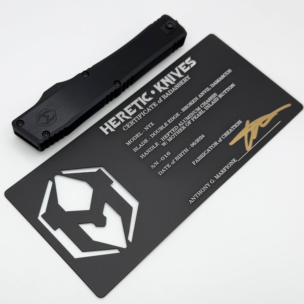 Heretic Custom NYX Hefted Aluminum Handle w/ Mother of Pearl Inlaid Button & D/E Damascus Pre Owned